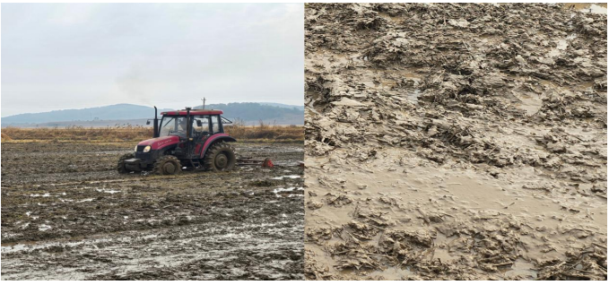 最受关注的湿耙作业环节,旋耕机带浆穿梭田间,将秸秆与泥浆深度混埋。小分队成员强调作业要点:“水稻收割后至耕层封冻前进行湿耙作业,在机械收获同时进行为宜;耙地前灌水深度≥5cm,耙地时田间保持水层1-2cm;耙地深度必须达15-20cm,地表残留量要控制在200g/m²以下,地面平整度高差不超过4cm,这样才能保证秸秆充分腐熟、不影响后续种植。”现场农户一边记录关键数据,一边用手机拍摄操作细节,不时提问互动,小分队耐心解答疑问,“秸秆湿耙还田后,草籽、病菌、虫卵饱和吸水,冬季内部水分结冰后体积膨胀,会直接破坏细胞壁和细胞膜,导致活性丧失,降低病虫草害风险”,小分队还同步讲解了翌年春季泡田3-5天后水耙、沉淀3-5天插秧等后续管理要点。