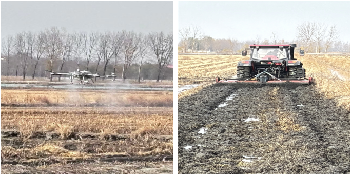 本技术环节是在水稻收获后采用刨地机将撒布在田间的秸秆深埋入15-20厘米土壤深层。采用无人机喷施腐熟剂作为配套技术,实现秸秆、腐熟剂与土壤充分混合,为秸秆腐熟发酵创造良好条件。利用秋冬春三季积温促进腐解,有效减少秸秆漂浮和养分损失,同时增加耕层厚度、提升土壤有机质,降低病虫草害风险。
