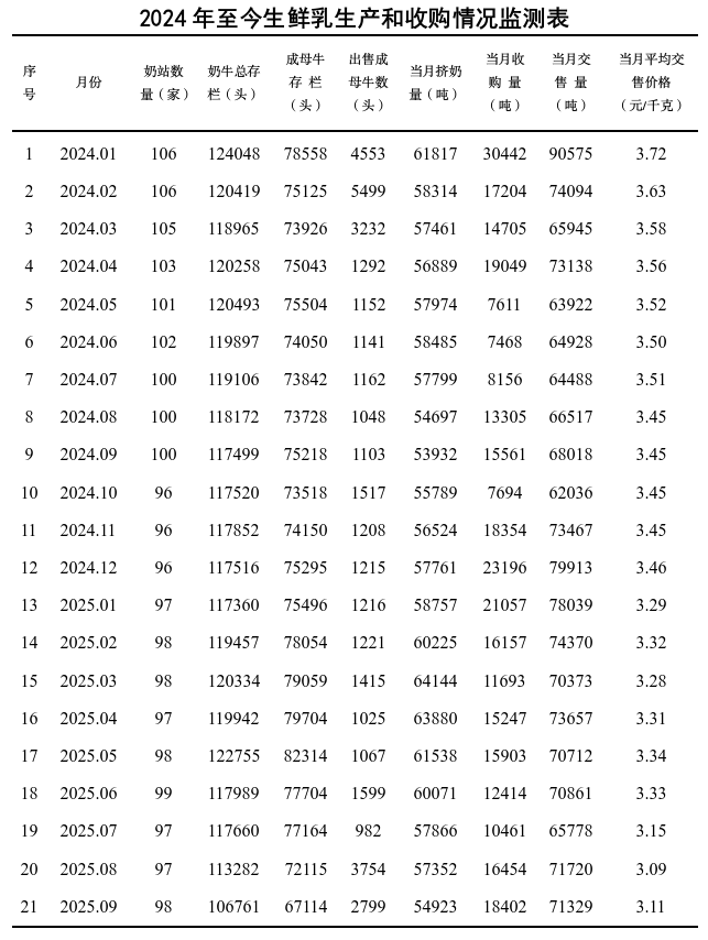 2025年9月,我省有生鲜乳收购站98家,同比减少2.0%,环比增加1.0%。全省与生鲜乳收购站有业务联系的奶牛存栏10.68万头,同比减少9.1%,环比减少5.8%;其中成母牛存栏6.71万头,同比减少10.8%,环比减少6.9%。本月全省出售成母牛0.28万头,同比增加153.8%,环比减少25.4%。当月挤奶与收购奶量合计7.33万吨,同比增加5.5%,环比减少0.7%;当月向加工企业交售生鲜乳7.13万吨,同比增加4.9%,环比减少0.6%;月平均交售价格3.11元/千克,同比减少9.9%,环比增加0.7%。