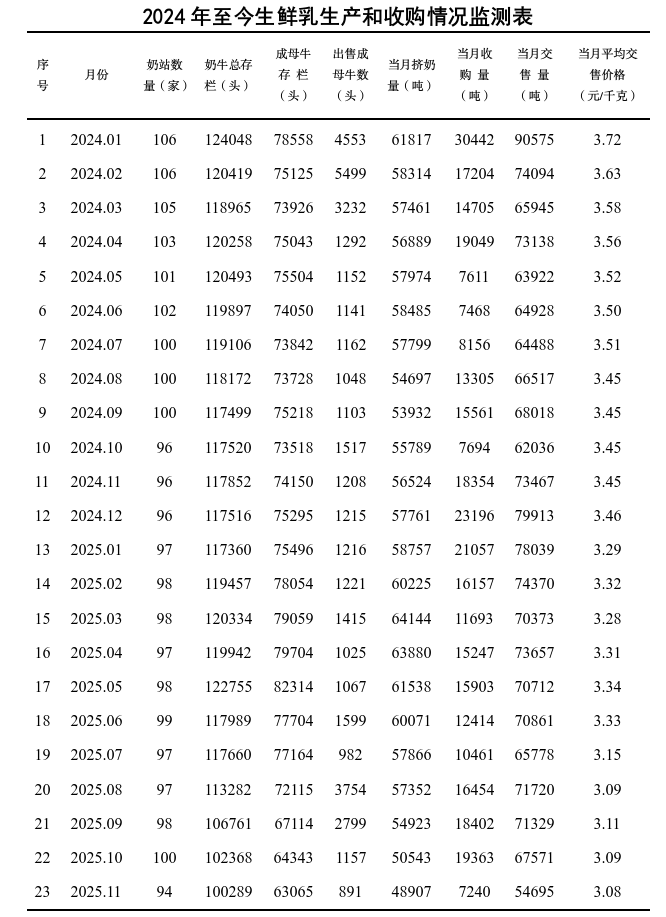 2025年11月,我省有生鲜乳收购站94家,同比减少2.1%,环比减少6.0%。全省与生鲜乳收购站有业务联系的奶牛存栏10.03万头,同比减少14.9%,环比减少2.0%;其中成母牛存栏6.31万头,同比减少15.0%,环比减少2.0%。本月全省出售成母牛0.089万头,同比减少26.2%,环比减少23.0%。当月挤奶与收购奶量合计5.62万吨,同比减少25.0%,环比减少19.7%;当月向加工企业交售生鲜乳5.47万吨,同比减少25.6%,环比减少19.1%;月平均交售价格3.08元/千克,同比减少10.7%,环比减少0.3%。