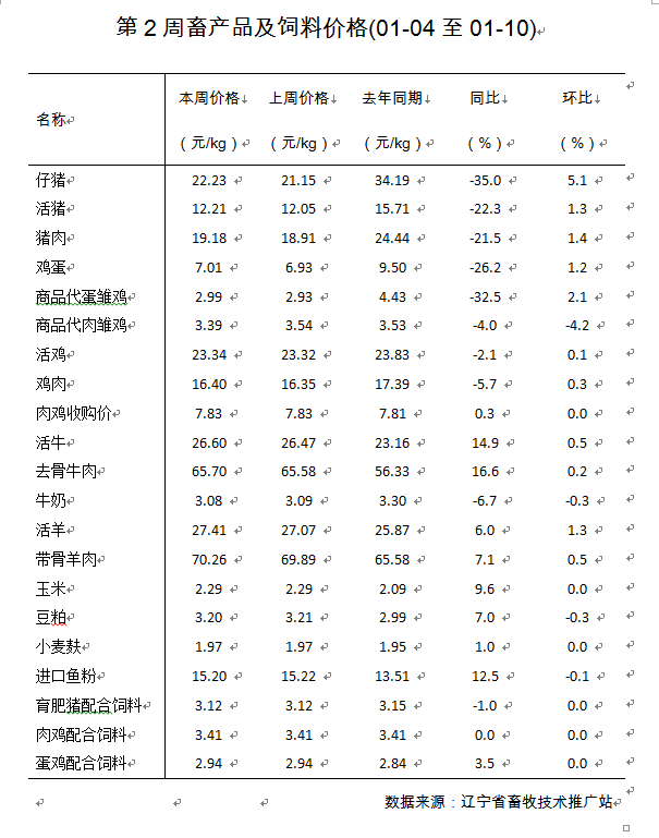 本周全省主要畜产品价格:活猪平均价格为12.21元/公斤,周环比涨1.3%,同比降22.3%;猪肉平均价格为19.18元/公斤,周环比涨1.4%,同比降21.5%;鸡蛋平均价格为7.01元/公斤,周环比涨1.2%,同比降26.2%;肉鸡收购平均价格为7.83元/公斤,周环比持平,同比涨0.3%;牛奶平均价格为3.08元/公斤,周环比降0.3%,同比降6.7%;活牛平均价格为26.60元/公斤,周环比涨0.5%,同比涨14.9%;去骨牛肉平均价格为65.70元/公斤,周环比涨0.2%,同比涨16.6%;活羊平均价格为27.41元/公斤,周环比涨1.3%,同比涨6.0%;带骨羊肉平均价格为70.26元/公斤,周环比涨0.5%,同比涨7.1%。