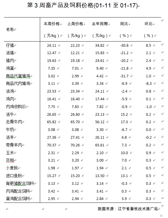 据对省内18个县(市、区)级监测点监测,1月份第3周主要畜禽及产品价格情况如下:除活羊、肉鸡和肉雏鸡价格下降外,其它畜产品和饲料价格为上涨态势。其中,仔猪价格相对涨幅较大,涨幅达8.5%,生猪和猪肉价格均连涨四周,本周涨幅分别为2.1%和2.4%。展望后市,随着春节越来越近,到了猪肉传统备货消费旺季,生猪和猪肉价格可能会继续小幅上涨,但受产能高位的制约,上涨幅度或有限。随着春节前仔猪补栏旺季逐步到来,后市仔猪价格仍有上涨空间。牛羊肉价格继续稳中略涨,本周均上涨0.2%。鸡蛋价格本周环比上涨4.9%,每公斤达7.35元,符合春节前备货产生的季节性变化规律,随着蛋价走高,部分蛋鸡养殖场户扭亏为盈。其它畜禽、产品及饲料价格变化不大。