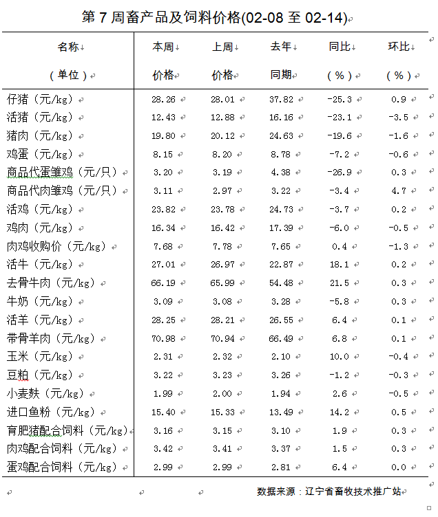 据对省内18个县(市、区)级监测点监测,2月份第2周主要畜禽及产品价格情况如下:仔猪价格继续向上,与前几周相比上涨幅度明显变小,本周微涨0.9%。就全省18个价格监测点看,涨跌不一,7个县区上涨,2个持平,9个下跌。目前不同地区仔猪价差较大,本周我省最高价在沈阳市辖区、盖州市、阜蒙县和绥中县,均达到32元/公斤;最低价出现在新宾县,为22元/公斤。仔猪价格之所以持续上涨,本质是供给、需求与市场主体行为共同作用的结果,预计短期仔猪价格走势仍将处于偏强态势。由于供应压力持续,生猪价格继续回落,本周生猪价格环比下降0.45元/公斤,降幅达3.5%。生猪年前供应充足,虽有春节的季节性消费支撑,但春节过后,供大于求态势更为明显,猪价或再度进入下行模式。受生猪价格下降影响,本周猪肉价格环比降1.6%,再次回到20元/公斤以下。随着节前备货和需求拉动接近尾声,鸡蛋价格连续上涨5周后,本周小幅下降0.6%。其它畜禽、产品及饲料价格相对平稳。