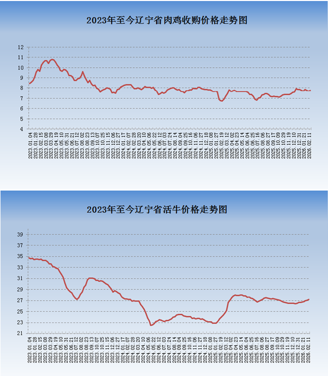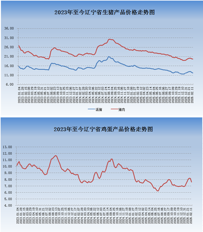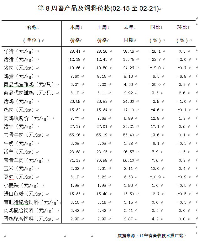 据对省内18个县(市、区)级监测点监测,2月份第3周主要畜禽及产品价格情况如下:仔猪价格继续向上,2025年12月份中旬以来已经连续上涨10周,累计上涨8.36元/公斤,涨幅达41.7%,但近几周上涨幅度明显放缓,本周仅微涨0.5%。预计短期内仍属季节性补栏高峰期,仔猪价格走势仍将坚挺。目前仔猪价格已经进入高位,养殖户一定要理性补栏,切勿盲目追高,避免后期生猪价格不及预期,影响养殖效益。仔猪补栏热情虽然高涨,但随着春节过后消费回落,节后生猪和猪肉价格继续下调,本周生猪价格环比下降0.25元/公斤,降幅达2.0%,猪肉价格环比降0.7%,回到20元/公斤以下。受节前补货充足影响,本周鸡蛋价格降幅较大,环比下降6.8%,为7.60元/公斤,重新回到8元/公斤以下,但预计近两月内价格仍将向下。随着节后复产推进,本周商品代蛋、肉雏鸡价格均环比提高2%以上。其它畜禽、产品及饲料价格相对平稳。