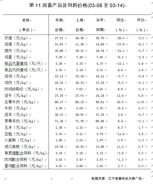据对省内18个县(市、区)级监测点监测,3月份第2周主要畜禽及产品价格情况如下:活牛价格在上周略降后,本周又出现小幅回调,全省平均价格环比微涨0.8%,代表新一轮肉牛价格小幅震荡局势已开启。按当前产能与屠宰、消费的综合情况看,肉牛价格仍将持续一段时间的以稳为主、小幅震荡形势,期间或出现小幅上扬。本周生猪价格继续震荡下行,全省平均价格下探至10.83元/公斤,是2021年9月下旬以来首次跌入“5元区间”。进入2月份后,猪价已经连续下跌6周,累计下跌2.1元/公斤,跌幅达16.2%。全省18个价格监测点中已有9个跌破11元/公斤,价格最低地区已达到9.8元/公斤。短期来看,猪价反弹动力不足,整体行情或持续偏弱运行,预计下半年价格才会有所好转。受生猪价格持续下跌影响,本周仔猪和猪肉价格均出现下跌,跌幅分别为3.0%和1.7%。受消费趋稳、产能高筑影响,本周鸡蛋价格继续向下,已连续下跌5周,累计下降了1.12元/公斤,降幅达13.7%。本周肉鸡、鸡肉价格均呈微降态势,其它畜禽、产品及饲料价格变化不大。
